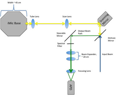 The microscope system for this class was built using a Till Photonics iMic system as the main body of the confocal system, with some extensive modifications to the optical path. An overall optical path setup can be seen below:
